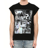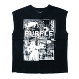 This sleeveless tee is cut from black 100% cotton textured jersey knit. This style features a large digital printed graphic with Purple Brand lettering on the front.